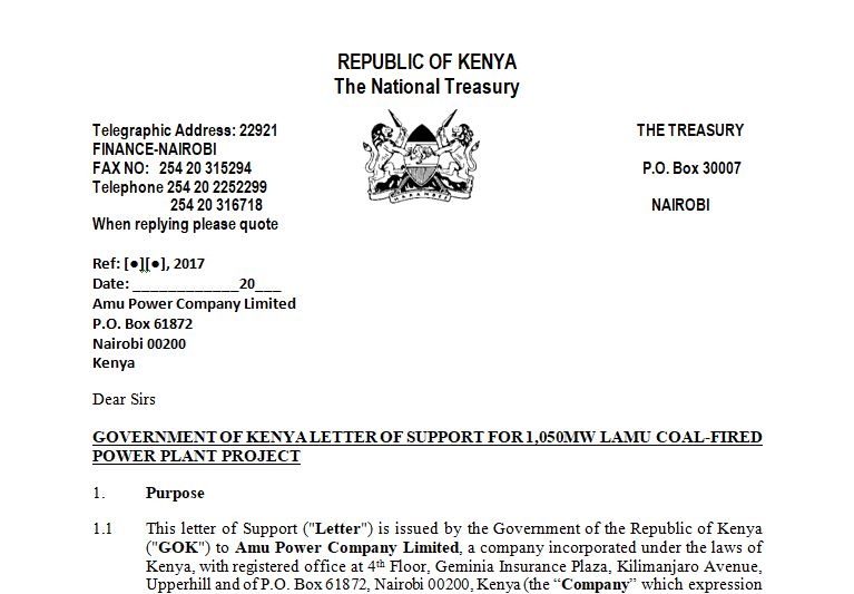 GOVERNMENT OF KENYA LETTER OF SUPPORT FOR 1,050MW LAMU COAL-FIRED POWER PLANT PROJECT Author: deCOALonize Published on: July 18, 2018 Published in: DOCUMENTS Download it here Post navigation Previous Article Previous Article POWER PURCHASE AGREEMENT AMU POWER COMPANY LIMITED AND amu power THE KENYA POWER AND LIGHTING COMPANY LIMITED for the Lamu Coal Power Plant Next Article Next Article Investors Call on General Electric to Pull Out of New Coal Plant Proposed in Kenya You may also like Objection to the granting of a license by the Energy Regulatory Commission for the 3X350MW Coal Plant in Lamu DOCUMENTS World Heritage Watch Report 2020 DOCUMENTS